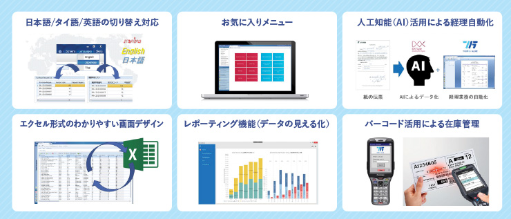同社は、タイおよび周辺国で200社以上に導入されている業務管理ソフト「THOMAS GLOBE」や、タイ国内だけで2,300社に導入されているグローバル対応の中堅企業向け会計システム「SAGE 300 ERP」などの提供を通じ、販売・生産管理、会計・税務業務の正確性を高めると同時に、単純作業の解消へと導いている(上図参照)。