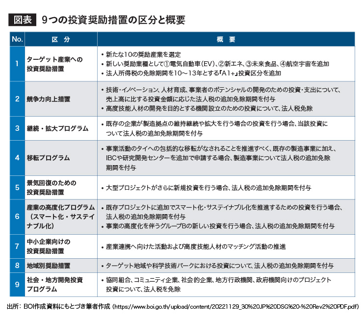 そして、この目的の達成のための具体的な施策として、BOIは9つの投資奨励措置を定めています。これら9つの投資奨励措置の区分と概要はそれぞれ図表の通りです。