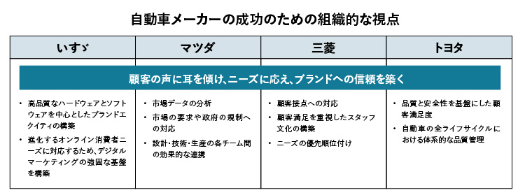 いすゞは、設計、製造、納品、アフターケアに至るまで、すべてのプロセスで品質保証に責任をもち、その結果、顧客から信頼を得ている。マツダは、設計者、技術者、品質管理者など複数のチームが連携し、最適な業務効率を実現している点も評価できる。また、問題が発生した場合にも、迅速に把握し対処している。三菱自動車は、顧客の多種多様なニーズに対応することが重要であると考えており、顧客との共通認識のもと、喫緊の課題から解決し、独自のセリングポイントを持つ車種を生み出している。最後に、トヨタは「安全・品質」を顧客に保証するために、安全・品質原則の遵守、顧客中心の変更管理など、顧客が直面する問題を減らすためのさまざまな基準や手順を持っている。このような方法の成功は、経営者が日々のオペレーションを注意深く監視することに大きく依存している。