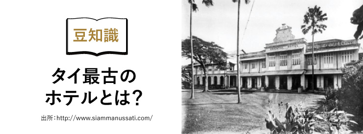 タイで初めてホテルが開業したのは1863年と言われている。時はラーマ4世(在位1804~68年)の時代。35年の来タイ後から亡くなる73年までタイに住んでいたアメリカ人宣教師ブラッドレイの記述によれば、ユニオンホテル及びボーディングホテルという2つのホテルが63年に開業したという。これが現状確認できるタイで最も古いホテルと見られている。経営者はいずれも外国人だったとされている。  ユニオンホテル、ボーディングホテル共に現在の場所は確認できないが、64年にはオリエンタルホテルが開業(これは現在のマンダリンオリエンタルホテルにあたる)。同ホテルは70年にタイで初めて電力が導入されたホテルでもあったという。