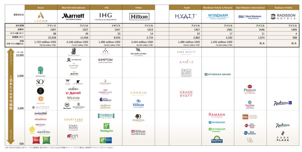 タイにおいてホテル業は、外国人に対して競争力が不十分な業種であるとして外国企業の参入が禁止されている業種だが、マネジメント(ホテル運営)は許可されており、国際的なホテルブランドは他国と同様にその存在感を放っている。上記の一覧表で紹介しているホテルグループも、誰もが一度は聞いたことがあるものだろう。それに対して、グループ名の下に連なるブランドを見て、その繋がりに驚いた人もいるのではないだろうか。