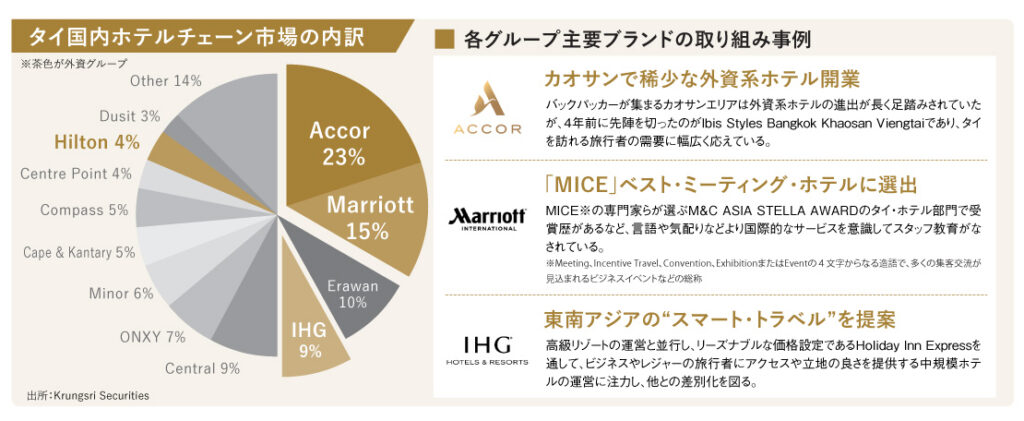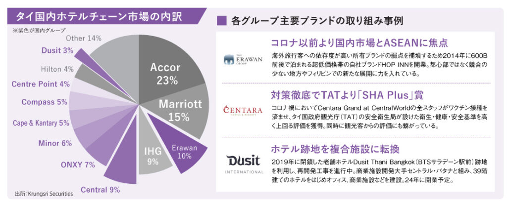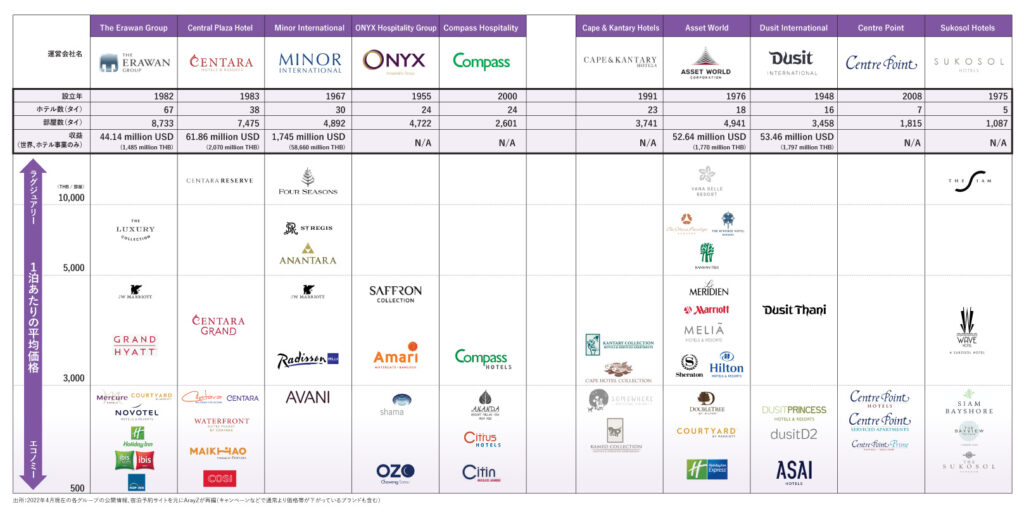 外資系グループと比べると知名度の差が大きい印象を受けるかもしれないが、その大元はタイ大手財閥の直属運営や、その傘下にある不動産企業が管理するなどその影響力・資金力は計り知れない。業界内の変遷も含め、各グループを確認したい。