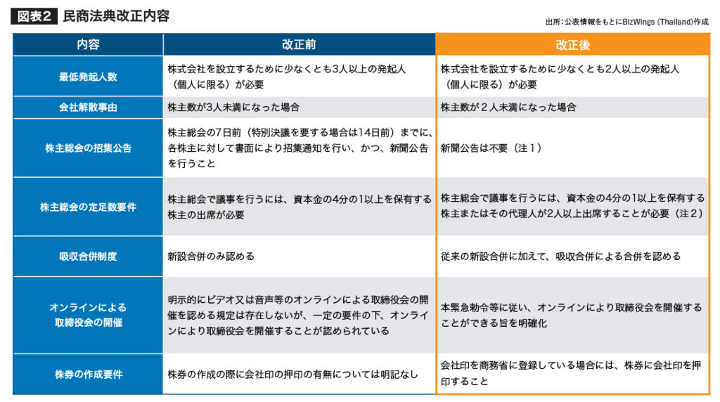 2022年11月8日に民商法典改正法(第23号)が公布され、23年2月から適用になりました。今回の改正は、ビジネスの柔軟性を高め、業務にテクノロジーを活用することを可能にして企業の負担を軽減し、タイでビジネスを行う上での効率を高めるという目的で行われました。改正の内容をまとめると、図表2のようになります。