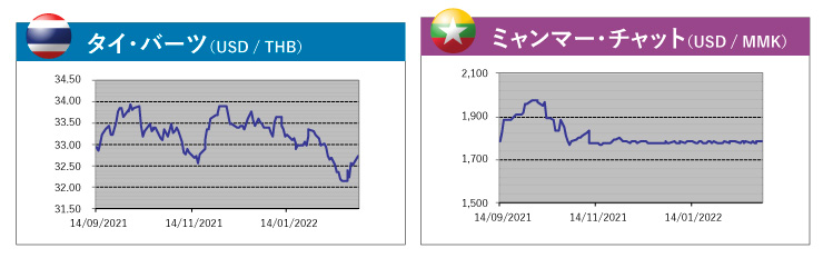 33バーツ前半で取引を開始し、欧州中央銀行(ECB)やイングランド銀行(BOE)等の中央銀行イベントは無難に通過。海外株式市場が堅調に推移してリスクオンが強まり、タイ中央銀行の金融政策委員会(MPC)ではインフレ対応よりも経済回復の優先度が高いことが確認された安堵感から32バーツ後半へ下落。中旬はウクライナ情勢が緊迫化したものの、欧州通貨や米ドルへのインフローが限定される中で地理的に影響を受けにくいタイのバーツは徐々に32バーツ前半へ。下旬、ウクライナ情勢が一段と混沌の様相を呈し、対ロシア経済制裁が各国から発表されると32バーツ半ばへと上昇したが、3月から外国人観光客に対する隔離措置緩和が発表されて反落。24日にロシア軍のウクライナ侵攻が報じられると32バーツ後半へ上昇し、その後もヘッドラインに連られて32バーツ半ば~後半で不安定な展開。